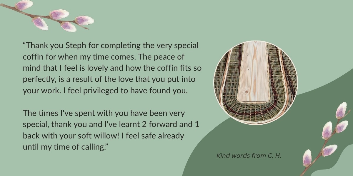 Hello! I’m Steph and I am an independent coffin maker, basket weaver and willow grower based in Leominster, North Herefordshire. I have a City & Guilds qualification in basketry and I have been weaving coffins since 2023.