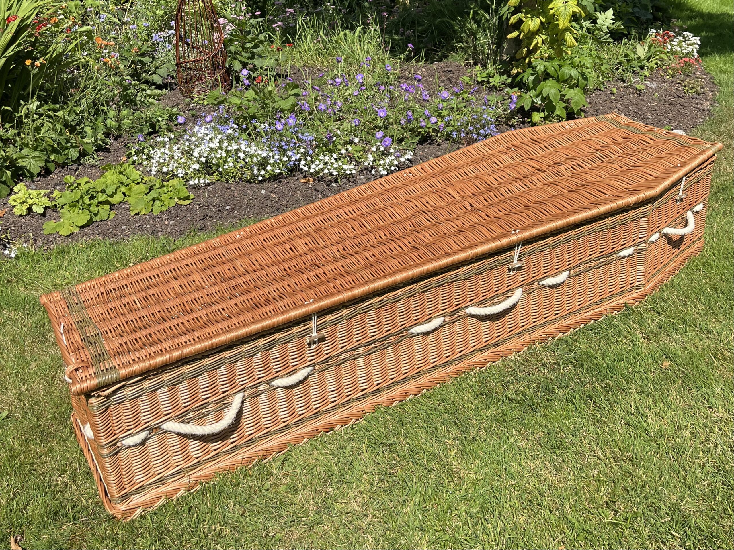The accredited willow coffin is woven onto an integrated plywood base, has two rounded ends and three weight bearing handles on each side.